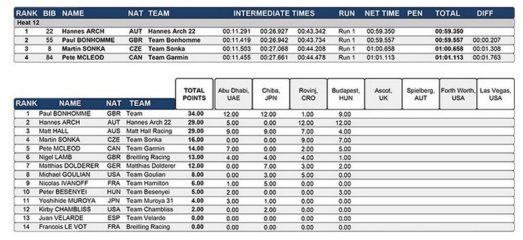 The third turn in the track belonged to Arch's long-term rival, Paul Bonhomme. Bonhomme's Edge was just off pace, and as the Brit passed through Gate 9 the split times were in the red and second lap efficiency was vital for the former World Champion. With two gates to go Bonhomme couldn't find the 0.2s he needed to surpass Arch at the top of the timesheets, clocking in at 59.557. It was ultimately up to Czech pilot Martin Sonka as the last man to fly to snatch the podium top spot from the Austrian.