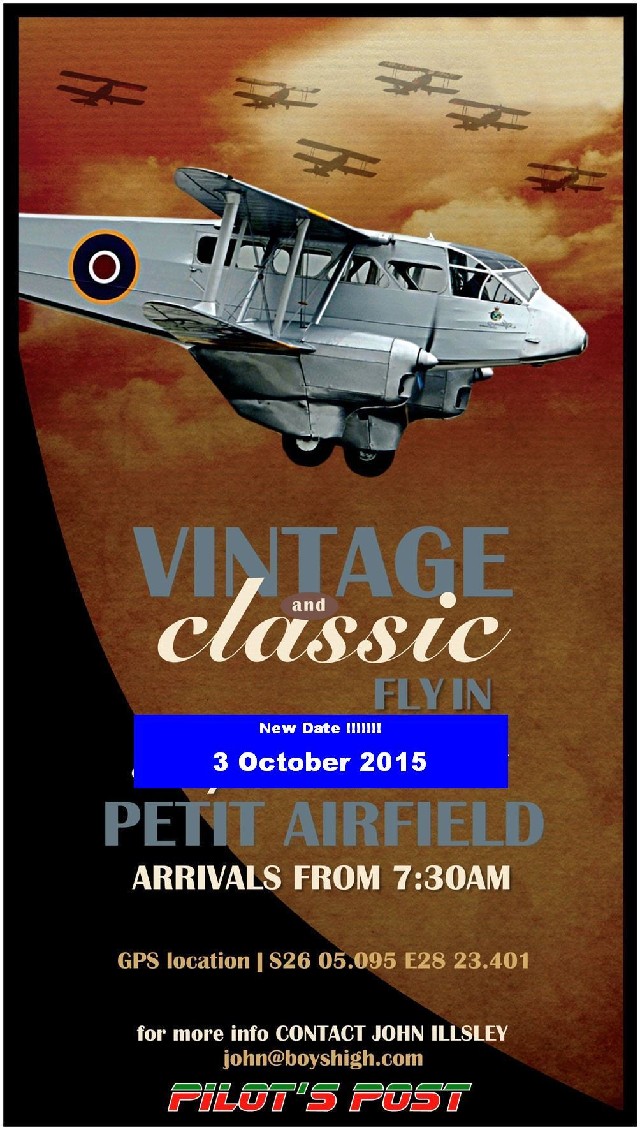 31 October: Bethlehem Aero Club fly-in and hangar dance. Contact Izak Venter e-mail: izak@motsu.co.za or Francois Marais e-mail: info@stanfra.co.za