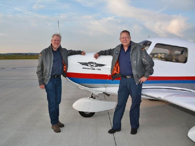 Andreas Albrecht (left) and Wolfgang Biereth(Right) with the diesel engine Piper PA-28 Archer III at Kassel Airport the start of the Africa Continental Mission. Photo © Volker K Tomalla