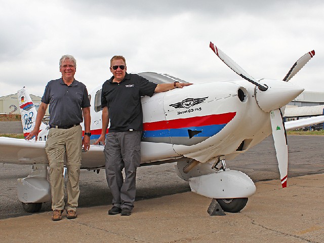 Andreas Albrecht (left) and Wolfgang Biereth(Right) with the diesel engine Piper PA-28 Archer III after landing at Lanseria International