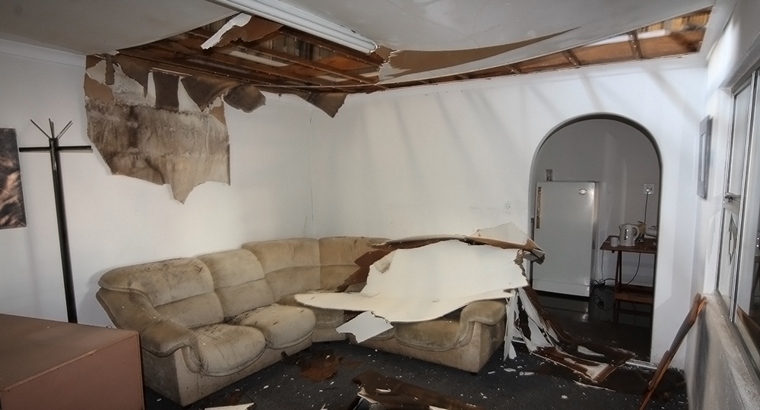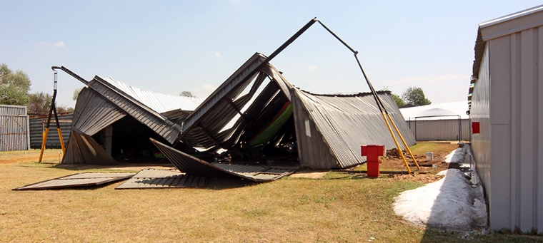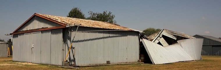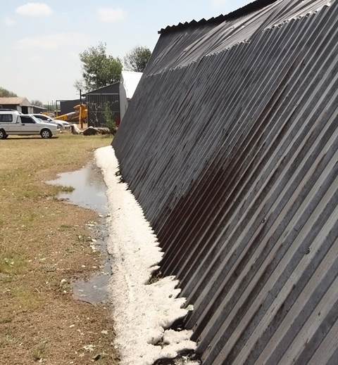 A carpet of hail of between 150mm and 200mm covered all the flat grass areas just after the storm and judging by that it was calculated that the weight of the hail that packed on the roofs would be close to 100kg for every square meter. To put that in perspective that's the equivalent of 2 cement bags per square meter of roof. None of the structures were designed to handle this type of weight.