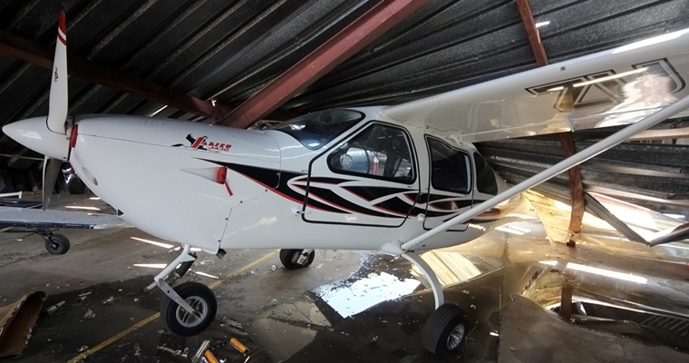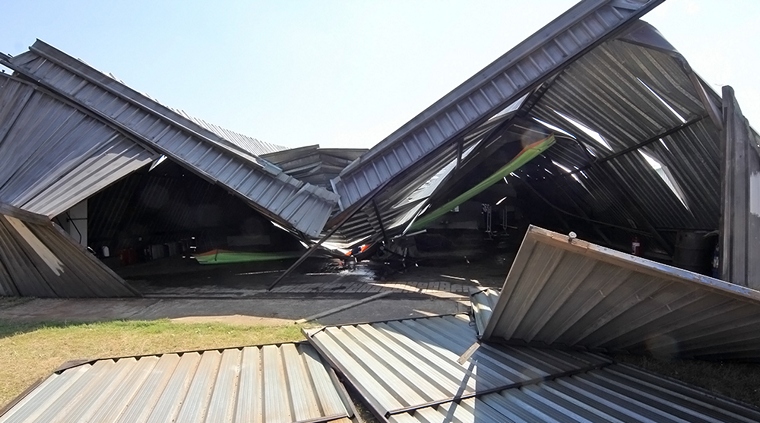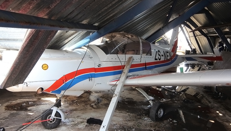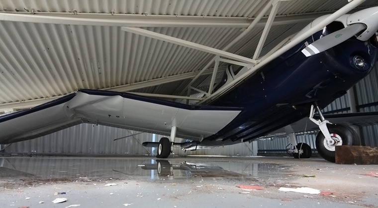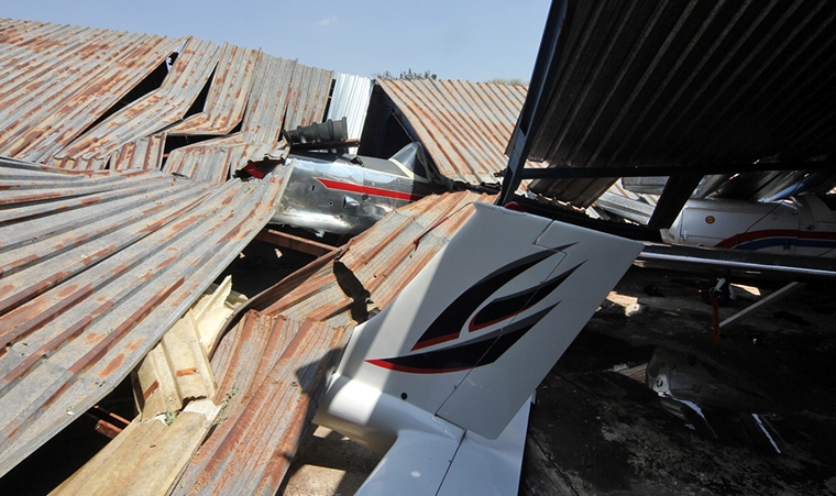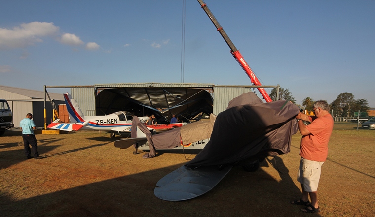 Walking around the airfield was like visiting a warzone; aircraft crushed by the bent steel beams of the hangars was reminiscent of an earthquake scene from a Hollywood movie. The culprit, the hail, still laying half a meter deep in places. The storm which approached from the South West moved through Ekhurleni leaving a trail of destruction in its wake, destroying more than 3,000 houses and leaving many people homeless. Motorists taking cover at a petrol station, sustained serious damage when the roof they were using to escape the hail collapsed.