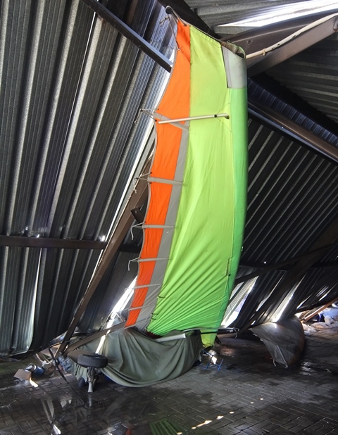 In another hangar a Sling 2 and a Piper PA28 were crushed leaving the Sling severely damaged, a quick inspection revealed what seemed to be a broken main spar on the Cherokee and the Sling's back seemed to have been snapped.