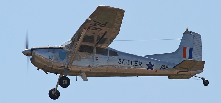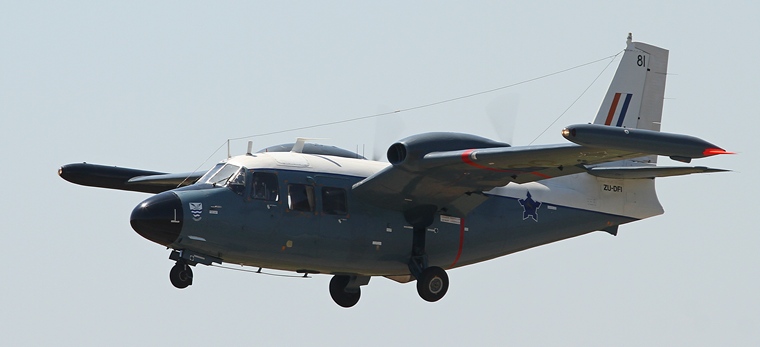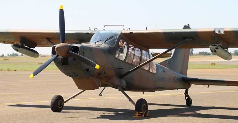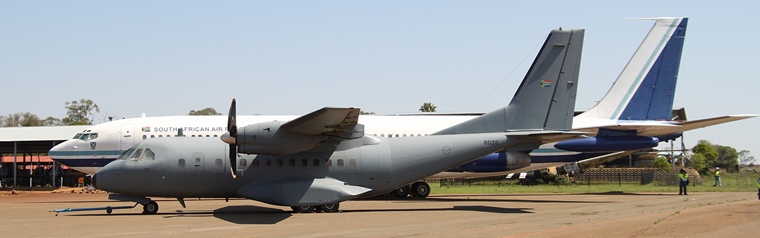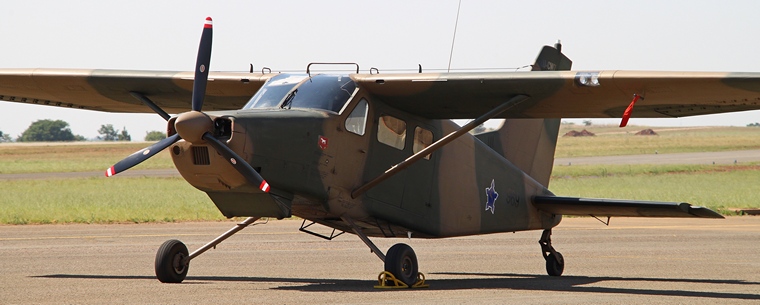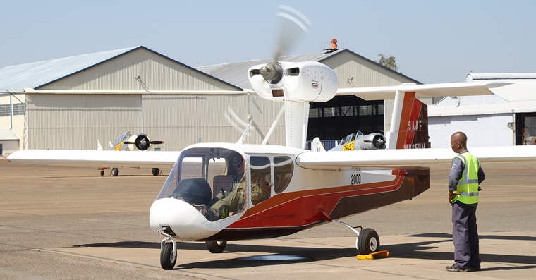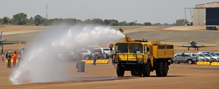 The large compliment of fixed aircraft comprises of the "one of a kind" Patchen Explorer, two Denel/Atlas Bosboks, Denel/Atlas Kudu, de Havilland Vampire T55, Piaggio P.166 Albatros and six North American T6 Harvard's, Cessna 185 and a Douglas DC3. The DC3 is currently not airworthy and the Vampire did not fly on Saturday. The number and type of aircraft flown depends on serviceability and on most fly days members of the Defence Force Parachutist also display their skills.