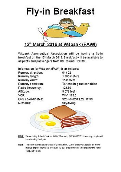12: Witbank fly in breakfast. Any interested parties to Contac Rob Clark @ 082 463 1372.