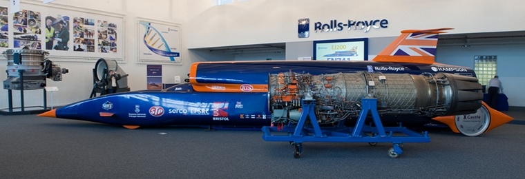 Designing a car able to reach 763 mph (1220.8 K/ph) and to break the sound barrier was a major undertaking. Designing a land vehicle that is a mix of car and aircraft technology to go almost 240 mph (384 K/ph) faster and reach 1,000 mph (1,609 K/ph) is entering uncharted territory. The front section of the Bloodhound is approximately 13.4m long and it weighs in at 7.5 tonnes. Bloodhound is of carbon fibre monocoque construction like a racing car whilst the rear section is a metallic framework and panels like an aircraft. The two front wheels sit within the body and two rear wheels are mounted externally within wheel fairings. The four 36-inch (910 mm) diameter wheels will rotate at up to 10,200 rpm and will be forged from solid aluminium to resist the 50,000 g centrifugal forces.