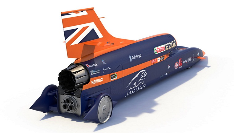The pencil-shaped Bloodhound is powered by a Rolls-Royce EJ200 jet engine developed for the Eurofighter that will take the car to 300 mph (480 km/h), after which a bespoke hybrid rocket designed by Nammo will boost the car up to 1,000 miles per hour (1,609 km/h). A third engine, a Jaguar supercharged V-8, will be used as an auxiliary power unit and to drive the oxidizer pump sourced from a Cruise Missile. The pump is able to feed 400 litre of oxidant per second to the Nammo hybrid rocket engine. Together the two powerplant will produce more than 135,000 horsepower: that's more than six times the power of all the Formula 1 cars on a starting grid put together.