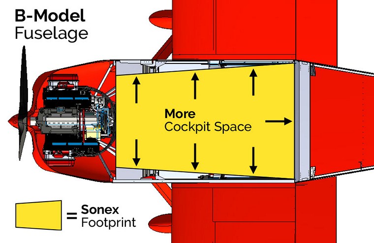 Sonex and Waiex B-Models have been enlarged by straightening of the forward fuselage sides, and feature improved creature comforts: