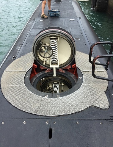 I'm no longer a youngster, but I'm still relatively agile. I Must admit though, getting into a submarine is no walk in the park. Boarding means placing your feet on a small ledge just below the surface of the man hole sized hatch, grabbing two handles and maneuvering onto an extremely narrow ladder. Looking down I realized that it was a pretty long way to fall.