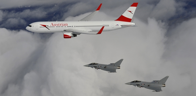 Two Austrian Eurofighter Typhoons are seen here escorting an Austrian Airlines Boeing 767-300ER Two Austrian Eurofighter Typhoons are seen here escorting an Austrian Airlines Boeing 767-300ER to a 'coerced' simulated 'landing' in Zeltweg in the centre of Austria.