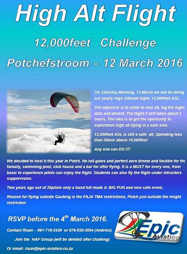 12: High Alt Flight Potchefstroom. RSVP before 4 March. Contact Riaan 061 719 2430 riaan@epic-aviation.co.za or Andries 076 520 3054