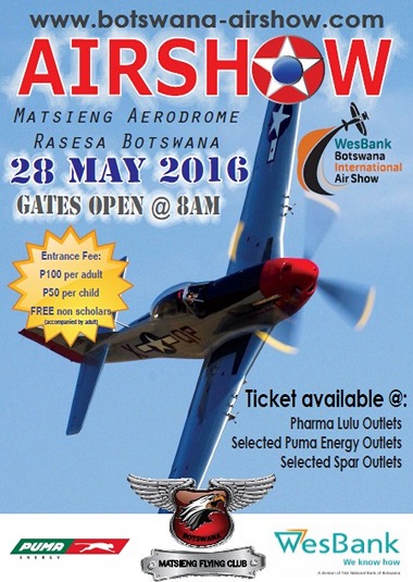 28: Botswana airshow at the Matsieng Flying Club. Contact Guillaume Knipe e-mail: gknipe@work.co.bw or Hentie de Wet e-mail: hentie@dewetdrilling.co.bw