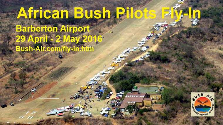 29 April-2May: Bush Air - Fly-In Barberton Airport, South Africa. No airshow and no public will be allowed in. There will be fun activities and competitions during the day such as spot landing, stol, ribbon cutting etc. The rest of the time it will be a big fat party! Fly-in and camp with your plane. An attendance fee of R2000 per person will include all your food (breakfast, lunch and dinner) as well as all drinks (Alcohol included) for the entire 3 day weekend. Payment info and to download registration and indemnity forms, go to web page: Deadline for all registrations will be Monday 25 April 2016.
