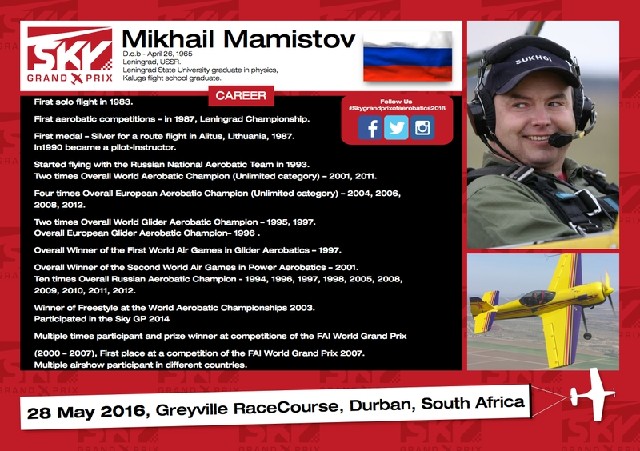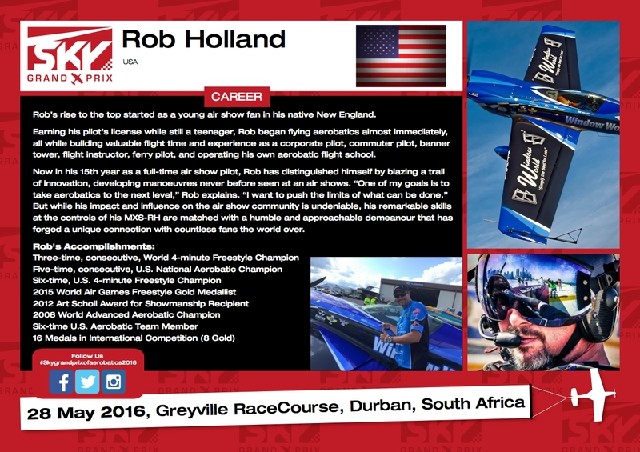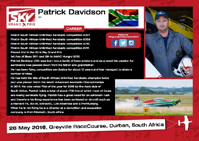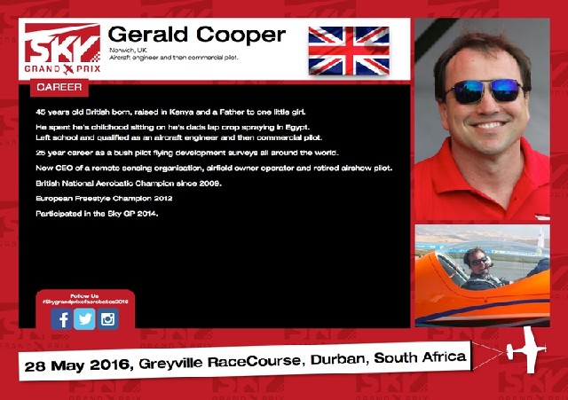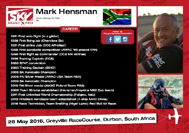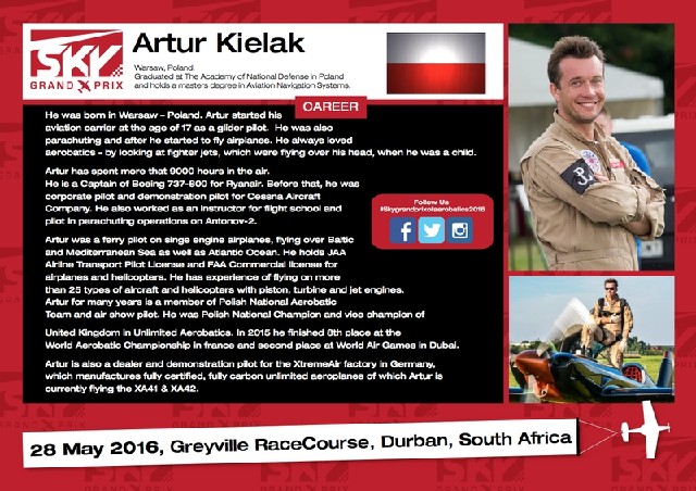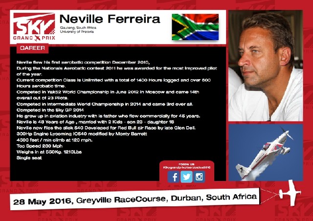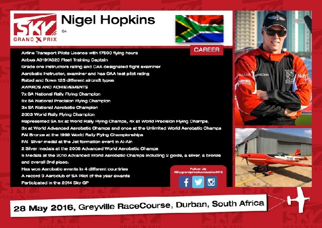 Sky Grand Prix Participants AnnouncedHeld in conjunction with the Annual Daily News 2000 horse race the extremely popular Sky Grand Prix of Aerobatics will return to the skies of Durban on the 28 May at Greyville Race Course.![]() The Sky Grand Prix will see over 10 thousand people descending on Greyville Race Course to enjoy top class aerobatic racing, fly pasts and other festivities that the organizers are planning for the day. ![]() Organizers of the event Roger Deare and Nigel Hopkins will be pulling out all the stops to guarantee a top rate event for Durban of which it is envisaged will be an annual spectacular. ![]() The Sky Grand Prix of Aerobatics is a competition, which will see 10 Experienced Aerobatic pilots competing against each other over the skies of Royal Durban Golf Course. ![]() This event is unique - and unlike other aviation events, it's not happening at an airport but in the skies above Greyville Race Course and the Royal Durban Golf Course. ![]() This event goes beyond any other aviation event that has been staged in Durban or South Africa. Spectators can look forward to the thrilling sounds and aerobatics of these flying machines as they execute their manoeuvres with speed and fine precision. ![]() The event is a Federation Aeronautique Internationale (FAI), FAI Aerobatics Commission (CIVA) internationally sanctioned event and is sanctioned locally by the Sport Acrobatic Club (SAC) and the Recreational Aviation Administration of South Africa. (RAASA). ![]() The competition requires these "Gladiators of the Sky" to perform breath-taking maneuvers using 25 meter pylons as markers. These pylons will be placed strategically on the Royal Durban Golf Course, and the pilot's technical maneuvers will be analyzed by a panel of SAC judges and will ultimately result in a Champion being crowned. ![]() The Greyville Race Course will be the central arena from which the spectators will have a prime view of the competition akin to watching the "Gladiators at the Colosseum". ![]() Event organizers are hoping that over and above staging a spectacular show on the day, the event will also add to the overall Durban event calendar, which will in turn see economic benefits to local businesses and job creation and growth in the tourism sector. This unique one of a kind event concept has the potential to be a major jewel in the crown for Durban. ![]() Tickets available via Computicket from the 4 April 2016 and will also be available at Greyville on the day. Ticket price: R220 for adults and R50 for children under 12. The event is supported by - Gold Circle, Royal Durban Golf Club and the Daily News For media enquiries contact Paul Godwin on 0835601185 or email mw.nerve@mweb.co.za We are also on Face book: www.facebook.com/skygrandprixofaerobatics2016 |