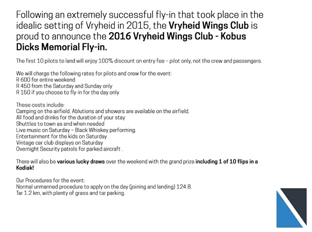 MIDWEEK UPDATE 18 MAY 2016THIS WEEK IN MIDWEEK UPDATE AvClicks Photo Competition……Plan Your Weekend……..Forthcoming Events Notice Board……..Aviation News………. Worldwide Incidents and Accidents This Week in Aviation History………Advertising Rate Card ![]() Pilot's Post is proud to launch its "AVclick 2016" aviation related photo competition. By entering your favourite photos, you will not only share your aviation photography passion with thousands of others, you will also stand a chance to win exciting prizes this year. Our prizes for this competition were carefully chosen to suit everyone's aviation interest and that is why we are offering the winner a choice between three different options. For more information go to: www.pilotspost.com/arn0000956 This Week's Four Finalist To vote for your favourite photo click on "Vote for" ![]() Vote for 3.1.....................Vote for 3.2 ![]() Vote for 3.3.....................Vote for 3.4 ![]() ![]() 21-21: Lowveld airshow - Nelspruit. Contact Willemien Hodgkinson e-mail: willemien.hodgkinson@ffa.co.za ![]() 20 - 22: Vryheid wings club fly inn. Following what we believe to be an excellent fly inn last year the Vryheid wings club will be hosting another fly inn this year. FIRST 10 PILOTS who flyinn on Friday and Also on the Saturday will get free food and drinks for the whole weekend (pilots only not entire crew). All other pilots and crew will be charged R 600 for entire weekend and R 450 from the Saturday and Sunday only (fly inn day only R150). Above costs include: Camping on the irfield (ablutions are being built currently on the airfield for all who wish to camp). All food and drinks for the selected time. Shuttles to town as needed. Live entertainment for the Friday and Saturday night. Entertainment on the day. Contact: Morne Strauss morne@lmsbrokers.co.za ![]() ![]() 16 - 20: Aero Club Safety Campaign: Tuesday 17 May Stellenbosch Flying Club evening, Wednesday 18 May Morning Star Flying Club evening, Thursday 19 May One of the Flight Schools in George daytime, Thursday 19 May AIFA Oudtshoorn evening. ![]() 25-29: Namibia-UIS / Brandberg / Save Some Rhino -fly-in, Swakopmund. Phone or mail Johan de Wet for info @ 00264 (0) 81 124 8283 or jdewet@mweb.com.na orHeiner Schlushe @ 00264 (0) 81 127 9100 21-22: SAC Free State regionals, Bloemfontein - New Tempe. Contact Annie Boon e-mail: chunge@mweb.co.za 25-28: SAPFA President's Trophy Air Race hosted by the Bethlehem Aero Club. Website: www.sapfa.org.za e-mail: Race@sapfa.org.za Contact Robbie Myburgh e-mail: roblena@mweb.co.za Cell: 083 377 0925 or Robin Spencer-Scarr 083 310 2850 e-mail: robin@stylegroup.com.au ![]() 28: Sky Grand Prix. Greyville Racecourse, Durban. Contact Paul Godwin Tel: 031 201 2169 Cell: 082 499 5222 e-mail: mw.nerve@mweb.co.za ![]() 28: Botswana airshow at the Matsieng Flying Club. Contact Guillaume Knipe e-mail: gknipe@work.co.bw or Hentie de Wet e-mail: hentie@dewetdrilling.co.bw ![]() 4: SAAF Museum flying training and open days. Contact Capt. Kobus Kapp 012 351 2342 or E-mail: webmaster@saafmuseum.org 4: Vintage Wings and Wheels and Magaliesburg Steam Express meet at FAKR Krugersdorp. Contact cwatson@stithian.com ![]() 4: Newcastle airshow. Contact Johan Pieters e-mail: info@champ.co.za 4: Kroon Airfield annual Fly-in. Our landing strip is 750m, excellent grass strip. Just to the South of the N4 highway to Rustenburg. RW 11/29 (RW29 now have NO overhead power lines.) The circuit is always to the North of the Runway, Lefthand for 11 and Righthand for 29. Freq: 124.8 (although we are South of the N4 Highway, our Circuit is to the North). Circuit Alt: 4700ft for Trikes and 4900 for fix wings. Airfield Alt: 4330ft. Lats: 25°39'33.90"S. Longs: 27°59'53.37"E 7- 9 June: Aero Club Safety Campaign, Kwa Zulu Natal: Tuesday 7 June Margate Flying Club evening, Wednesday 8 June Pietermaritzburg Aero Club evening, Thursday 9 June Virginia Airport Durban evening. 8: Aero Club's 75th AGM 14th of April 2016 at 18:30 at the Harvard Conference Centre at Rand Airport,Germiston. RSVP Sandra Strydom on e-mail to office@aeroclub.org.za. 9-11: Provisional date ZimNavex Zimbabwe . Contact Mel Cooper e-mail: zmelzim@gmail.com 10-12: Wonderboom Wings and Wheels airshow. Contact Chris Briers chris@airteam.co.za Cell: 082 568 7988. Wonderboom Airport and is gearing up to be one of the biggest civilian airshows of 2016. The event is to be part of Wonderboom Airport's 80th birthday celebrations and in partnership with the City of Tshwane, Airlink and the tenants of Wonderboom airport, some of whom have been operating at the since its early days, the organisers would like to see the airport flourish again. They have decided to take it upon themselves to put on the 'Adrenaline Show', which will be a combination of Hot Rod cars, Muscle cars, Superbikes and an air show featuring the best of the South African displays. Considered to be a first for South African air shows, will be the 4,1Km race track and a 950 metre drag race strip, which will give attendees a unique mix of aviation and motorsport over the two days, with the 10 June marked as the career day. Another first for an air show will be the hosting of the Street Rod and Muscle Car Nationals. ![]() 17-19: Memorial fly in and airshow Mafeking. Contact Connie Conradie e-mail: info@mmafikeng-flyingclub.co.za 18: Whisper Carnarvon fly in. For information go to www.facebook/whisperaircraft 28 -29: Aviation Festival Africa Sandton Convention Centre Johannesburg. Contact Bianca Wiener e-mail: bianca.wiener@terrapinn.com 30 June-3 July: Race of Champions at Kubu Island Botswana. Contact Chris Briers chris@airteam.co.za Cell: 082 568 7988 ![]() ![]() To buy a ticket, payment can be done either by EFT (details below) or cash, and is limited to 300 tickets sold, so buy soon to avoid disappointment. Email proof of payment to rob@aerosud.co.za with your name, email address and cell number (important to provide as winning ticket could be a 