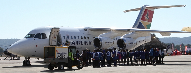 South African Airlink provided the students with an opportunity to board their Bae 146/Avro RJ85 static display parked on the apron. Once seated aboard they were briefed on the various career choices that were available to them.